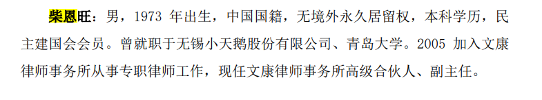 彼时上市公司为柴恩旺附注的简介为……2005加入文康讼师事务所从事专职讼师责任,现任文康讼师事务所高等结伙东谈主、副主任。