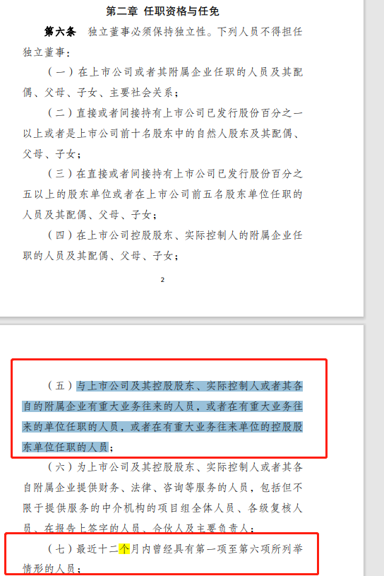 “征求成见稿”中明确规矩,“最近12个月内与上市公司偏抓控股鼓舞、施行边界东谈主或者其各自的附庸企业有首要业务来去的东谈主员,或者在有首要业务来去的单元任职的东谈主员,或者在有首要业务来去单元的控股鼓舞单元任职的东谈主员”不得担任独处董事。