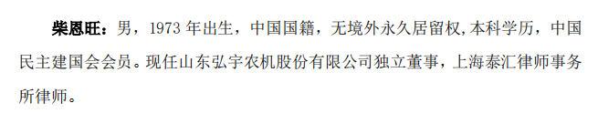 也等于说,时隔三年柴恩旺终于当选康普顿独处董事。根据康普顿于本年5月20日发布的公告,柴恩旺简介也随之“更新”:男,1973 年出身,中国国籍,无境外遥远居留权,本科学历,中国民主开国会会员。现任山东弘宇农机股份有限公司独处董事,上海泰汇讼师事务所讼师。